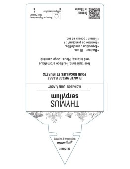 cached liste de souhaits cached THYMUS SERPYLLUM voir Thym... Les variétés HORS STOCK sont imprimées en commandes groupées.Délai de livraison : de 10 à 15 jours.Minimum de commande par variété : 50 ex. 5,84 € cached Ajouter au panier