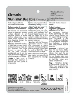 Nouveau accueil Clematis SAPHYRA® Duo Rose 'Cleminov 29' * Prix dégressif en fonction des quantités :Prix H.T. départ pour 50 chromos• de 50 à 2 950 chromos = 9.08 € HT - (1 à 59 paquets de 50 chromos)• de... 9,35 € Prix cached Ajouter au panier cached liste de souhaits cached