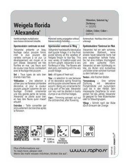 Nouveau cached liste de souhaits cached accueil Weigela florida 'Alexandra' * Prix dégressif en fonction des quantités :Prix H.T. départ pour 50 chromos• de 50 à 2 950 chromos = 9.08 € HT - (1 à 59 paquets de 50 chromos)• de... 9,35 € cached Ajouter au panier