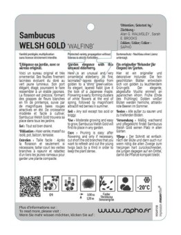 Nouveau cached liste de souhaits cached Sambucus WELSH GOLD 'WALFINB' Les variétés HORS STOCK sont imprimées en commandes groupées.Délai de livraison : de 10 à 15 jours ouvrés.Minimum de commande par variété : 50 ex. 12,44 € Sélectionner une option