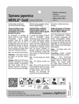 Nouveau accueil Spiraea japonica MERLO® Gold 'DAVCOP04' Les variétés HORS STOCK sont imprimées en commandes groupées.Délai de livraison : de 10 à 15 jours ouvrés.Minimum de commande par variété : 50 ex. 12,44 € Prix Sélectionner une option cached liste de souhaits cached