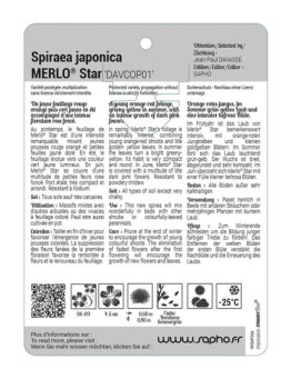 Nouveau accueil Spiraea japonica MERLO® Star 'DAVCOP01' Les variétés HORS STOCK sont imprimées en commandes groupées.Délai de livraison : de 10 à 15 jours ouvrés.Minimum de commande par variété : 50 ex. 12,44 € Prix Sélectionner une option cached liste de souhaits cached