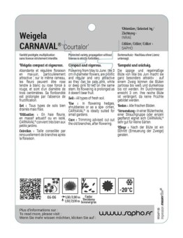 Nouveau cached liste de souhaits cached accueil Weigela CARNAVAL® ‘Courtalor’ Les variétés HORS STOCK sont imprimées en commandes groupées.Délai de livraison : de 10 à 15 jours ouvrés.Minimum de commande par variété : 50 ex. 12,44 € Sélectionner une option
